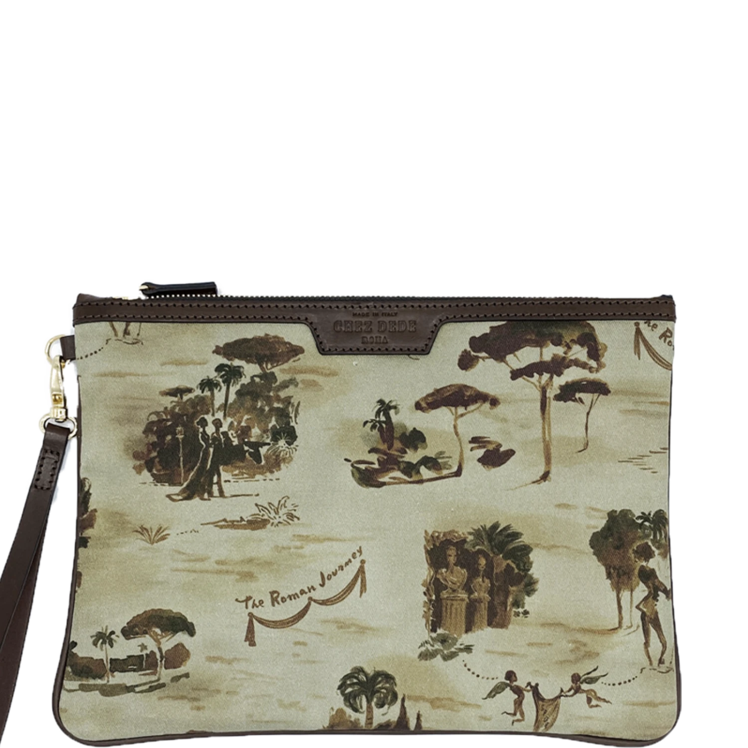 La maison franco-italienne Chez Dédé propose des collections exclusives qui reflètent la qualité de l’artisanat italien : un mélange d’art, de finesse et de savoir faire. Le Clutch The Roman Journey est une pochette en coton et en cuir de veau italien à tannage végétal. Il a été imaginé par le fondateur de la marque, Andrea Ferolla, et fabriqué en Italie. La pochette, assortie au grand sac de la même collection, est parée de motifs finement dessinés qui font écho au voyage. Elle possède une anse en cuir détachable. Son petit format est parfait pour y ranger tout son nécessaire et l’emporter partout avec soi.