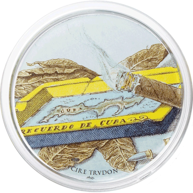 La coupelle en verre Ernesto doublée d’un socle en feutre noir est le fruit de l’artisanat Trudon. Un cigare se consumant, déposé au milieu de feuilles de tabac fraîches. Une illustration de Lawrence Mynott, peintre et illustrateur anglais.
