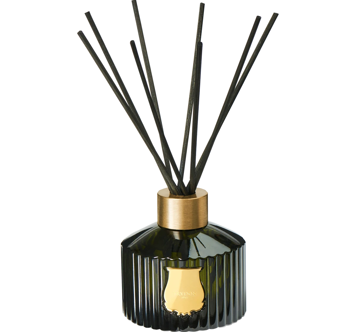 Pour compléter la ligne de diffuseurs après La Promeneuse, Le Vaporisateur et l’Oeuf, Le Diffuseur fait son apparition habillé en verre cannelé et orné d’un écusson or Trudon. Il parfumera vos intérieurs grâce à ses recharges disponibles dans vos senteurs préférées : Abd El Kader, Cyrnos, Ernesto, Joséphine ou encore Spiritus Sancti. Il est orné d’une bague en aluminium et traversé par huit batonnets noirs en rotin naturel, le tout dans une logique de respect de l’environnement.